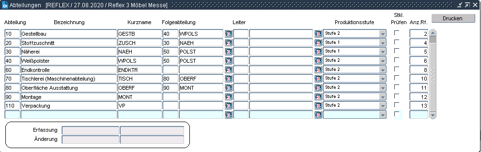 Diese Maske dient der Verwaltung und Anzeige der einzelnen Abteilungen mit den jeweiligen Folgeabteilungen in der Produktion. Zusätzlich gibt es hier die Informationen, zu welcher Produktionsstufe die Abteilung gehört, in welcher Reihenfolge sie erscheinen soll und ob die Stücklisten generell für diese Abteilung geprüft und freigegeben werden müssen.