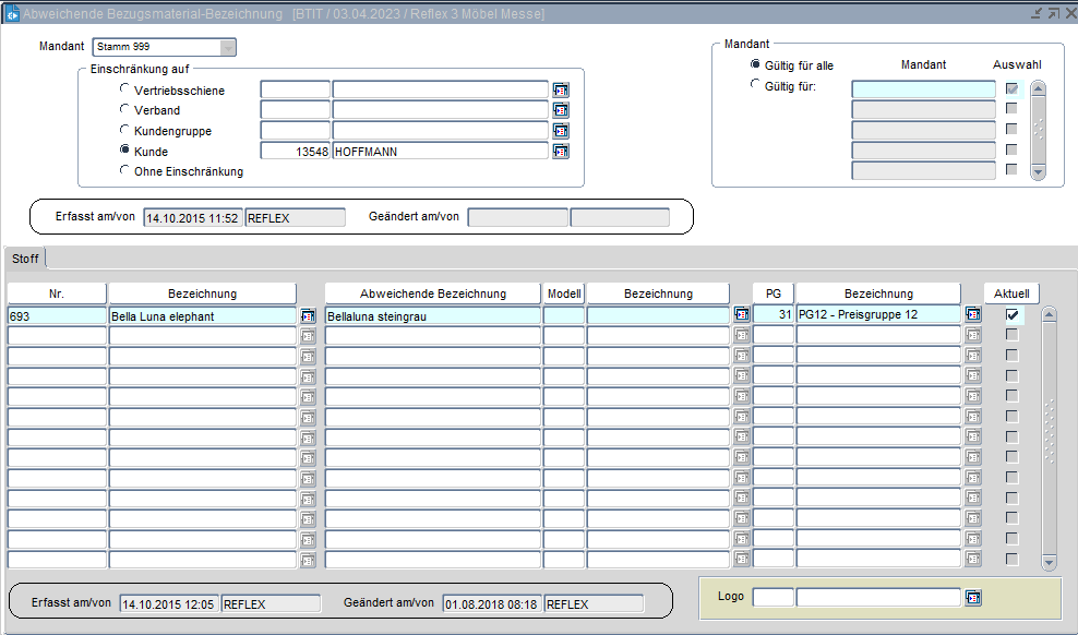 Wird eine Bezugsmaterial-Bezeichnung über eine bestimmte Vertriebsschiene, an einen Verband, Kunden oder einer Kundengruppe oder auch ohne eine bestimmte Einschränkung nach außen mit einer anderen Bezeichnung gehandelt, so wird hier die abweichende Bezugsmaterial-Bezeichnung hinterlegt. Zusätzlich besteht die Möglichkeit, gleichzeitig ein abweichendes Logo des Bezugsmaterials zu verwalten.