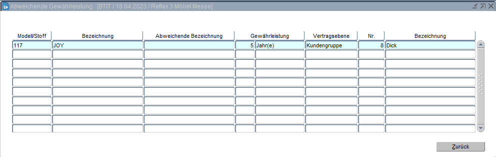 Sind für die Produkte zu einem Reklamationsvorgang abweichende Gewährleistungen hinterlegt, so werden diese in dieser Maske angezeigt.
