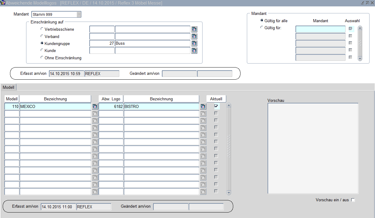 Hier kann eingegeben werden, wofür die Abweichung gilt. Zur Auswahl stehen: Vertriebsschiene, Verband, Kundengruppe, Kunde. Es besteht aber auch die Möglichkeit des abweichenden Modelllogos ohne weitere Einschränkung einer Gruppierung.