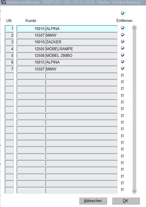 Lädt die aktuelle Kundenauflistung in eine Maske zur weiteren Bearbeitung. Hier können Kunden, die aus der Liste gelöscht werden sollen, entsprechend markiert und entfernt werden. Nach der Bearbeitung und Bestätigung mit dem Button OK wird die Kundenauflistung für den Zuteilungsauftrag aktualisiert.