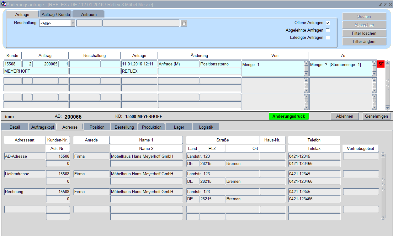 Die Adressdaten des Auftrages für die Änderungsanfrage werden in dieser Registerkarte aufgeführt.