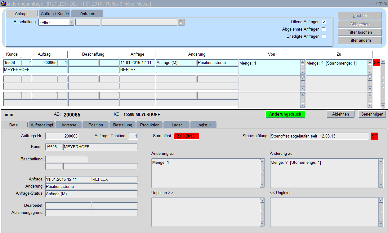 Für den Genehmigungs- und Ablehnungsvorgang steht dem Entscheidungsträger die Anwendung „Änderungsanfrage" zur Verfügung, in der er über den Filterbereich nach verschiedenen Kriterien die Änderungsanfragen im Ergebnisbereich anzeigen lassen kann: Beschaffung, Auftrag bzw. Kunde oder nach dem Zeitraum der Anfragen. Die Beschaffung (nur bei Artikel-, Mengen- und Preisänderung) gibt an, von wo aus die Auftragsposition beschafft wird: Lager, Produktion oder Lieferant.