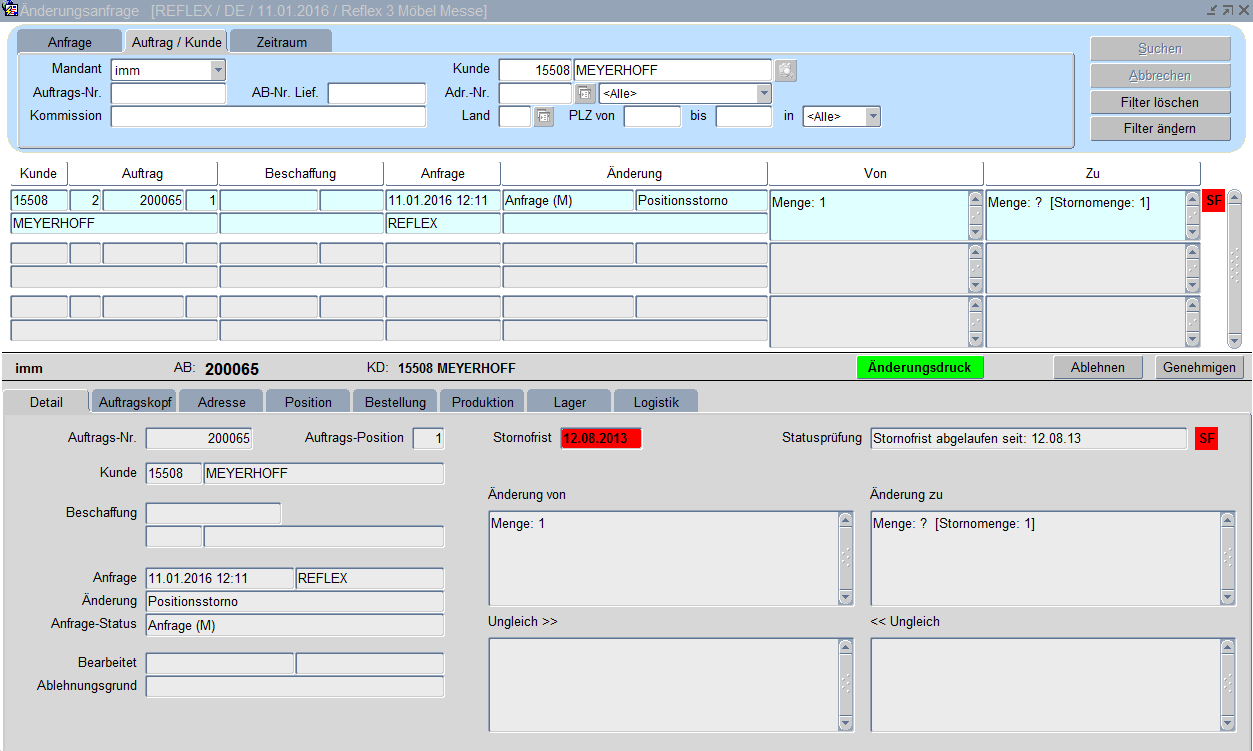 Für den Genehmigungs- und Ablehnungsvorgang steht dem Entscheidungsträger die Anwendung „Änderungsanfrage" zur Verfügung, in der er über den Filterbereich nach verschiedenen Kriterien die Änderungsanfragen im Ergebnisbereich anzeigen lassen kann: Beschaffung, Auftrag bzw. Kunde oder nach dem Zeitraum der Anfragen. Die Beschaffung (nur bei Artikel-, Mengen- und Preisänderung) gibt an, von wo aus die Auftragsposition beschafft wird: Lager, Produktion oder Lieferant.