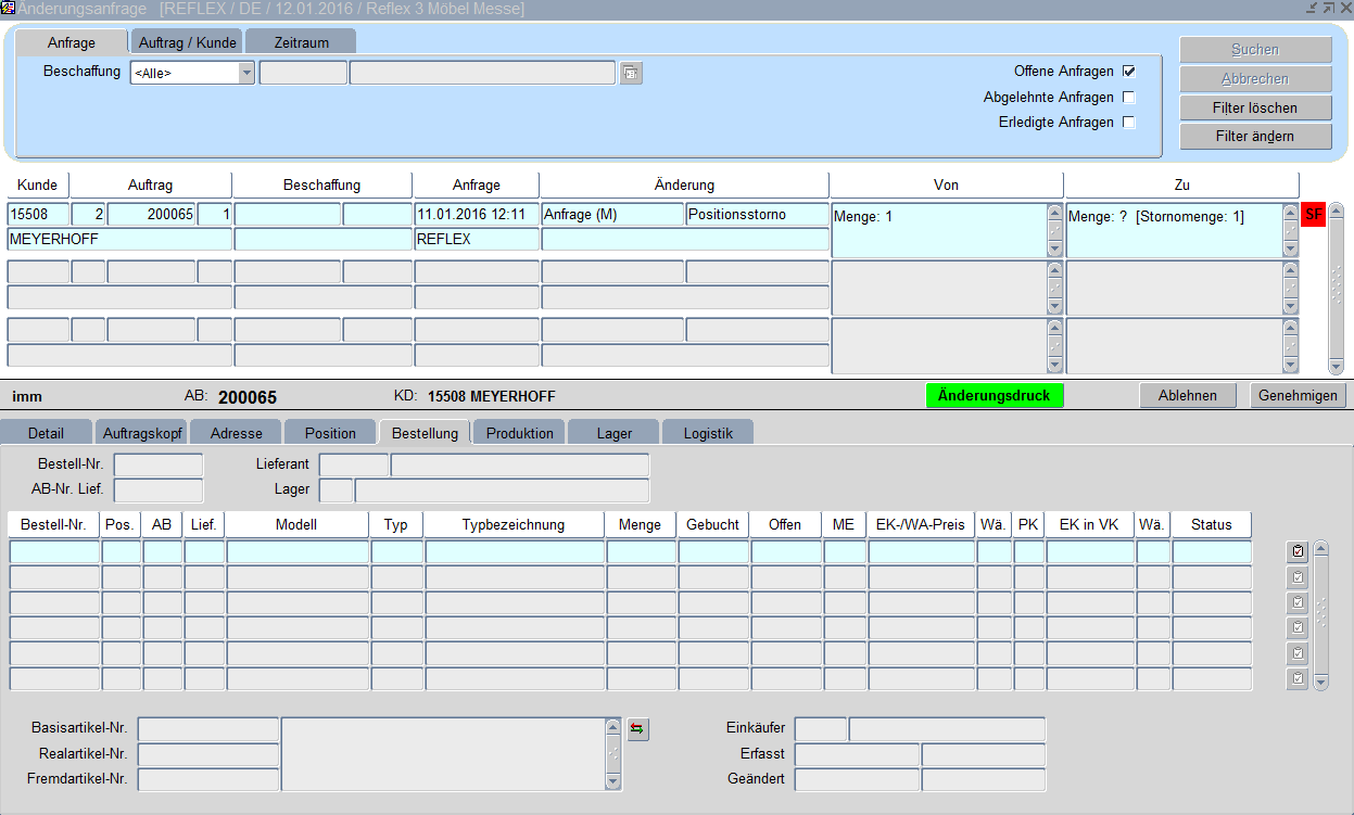 Wurden die beauftragten Artikel des Änderungsauftrages bei einem Lieferanten bestellt, so werden hier die entsprechenden Daten angezeigt. Der Button neben der Postion