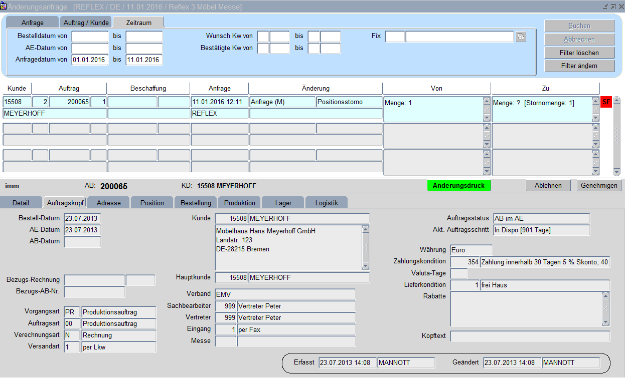 Für den Genehmigungs- und Ablehnungsvorgang steht dem Entscheidungsträger die Anwendung „Änderungsanfrage" zur Verfügung, in der er über den Filterbereich nach verschiedenen Kriterien die Änderungsanfragen im Ergebnisbereich anzeigen lassen kann: Beschaffung, Auftrag bzw. Kunde oder nach dem Zeitraum der Anfragen. Die Beschaffung (nur bei Artikel-, Mengen- und Preisänderung) gibt an, von wo aus die Auftragsposition beschafft wird: Lager, Produktion oder Lieferant.