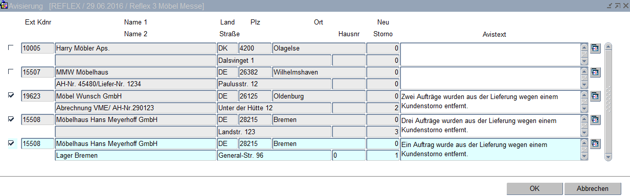Mithilfe der Checkboxen können die Kunden, an die ein Änderungsavis gesendet werden soll, gekennzeichnet werden. Beim Öffnen des Fensters werden vom Programm automatisch die Kunden markiert, die von irgendeiner Änderung (Erweiterung oder Storno) seit der letzten Avisierung betroffen sind.