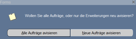 Mit Anklicken des Buttons „OK" rechts unten ist die Avisierung zu starten. In einem Dialogfenster kann dann gewählt werden, ob das zu sendende Dokument die Änderungen seit der letzten Avisierung oder die ganze Auftragsliste zum Kunden enthalten soll.