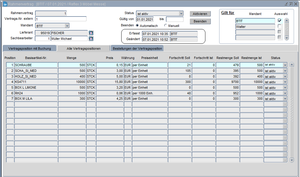 Gibt Auskunft über den Status im Rahmenvertrag (wird erfasst, aktiviert oder vollständig)