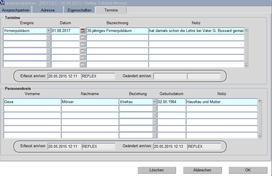 Private Termine des Ansprechpartners und von Personen aus seinem persönlichen Umfeld werden in dieser Maske gespeichert und gepflegt.