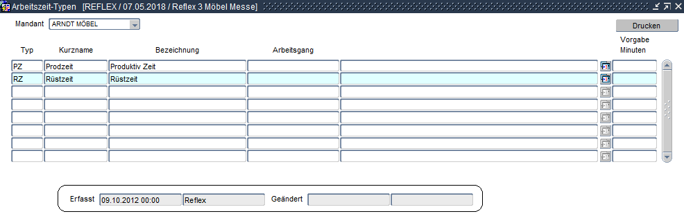 Die Art der Arbeitszeit kann in dieser Maske hinterlegt werden. Die vorhandenen Arbeitsgänge können dann den Arbeitszeit-Typen zugeordnet werden. Reflexinfo