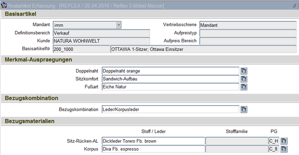 Polstermöbel haben immer das Merkmal „Bezugskombination“, da in der Auftragserfassung der Stoff- oder Lederbezug des bestellten Möbelstücks definiert werden muss.