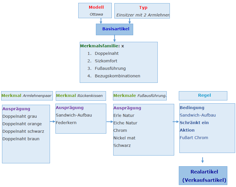 Statt über eine starre Artikelnummernfolge werden die Produkte über eine Kombination von einem Basisartikel und den dafür möglichen Merkmalen festgelegt.