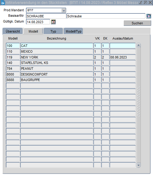 Auf der Registerkarte „Modell” wird die Liste der unterschiedliche Modell angezeigt, in denen das Material verwendet wird.