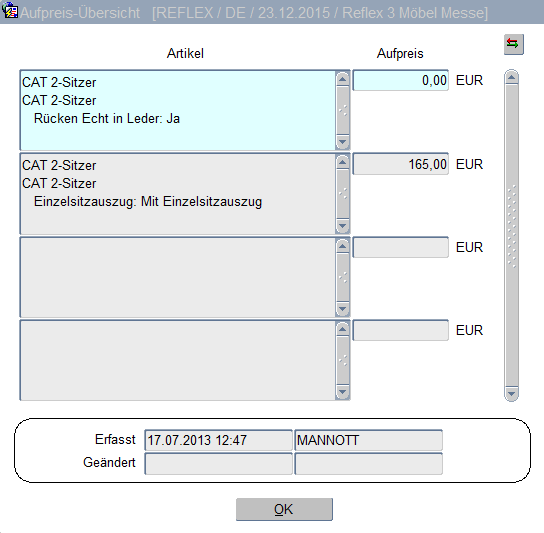 Handelt es sich um einen Basisartikel, dessen Merkmale verkaufsseitig mindestens eine aufpreisrelevante Ausprägung beinhaltet, wird vom System in der Auftragsposition ein Aufpreis gezogen. Die einzelnen Aufpreise sind in dieser Maske einzeln aufgeführt. Die Aufpreise für Ausprägungen werden wie alle Verkaufspreise im Programm Preisverwaltung hinterlegt.