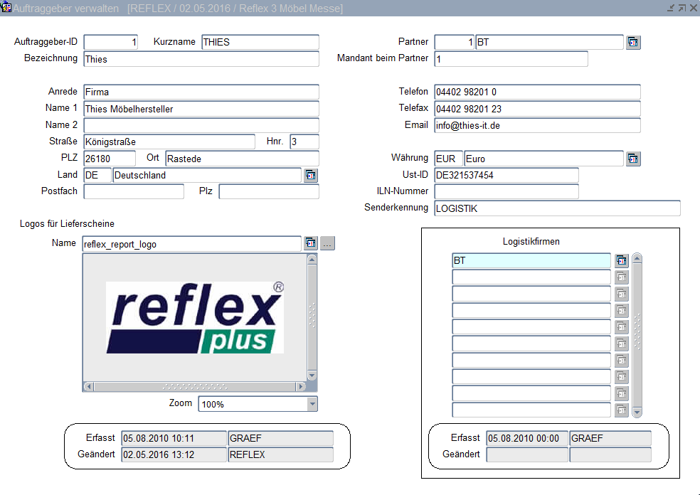 Die Logistikabwicklung ist ein eigenständiges Modul unter Reflex Plus. Die Logistikfirma übernimmt die Tourenplanung und logistische Abwicklung für sämtliche Mandanten, die in dieser Form als Auftraggeber verwaltet werden. Somit tritt der jeweilige Mandant als Auftraggeber bei den verschiedenen Speditionen auf.