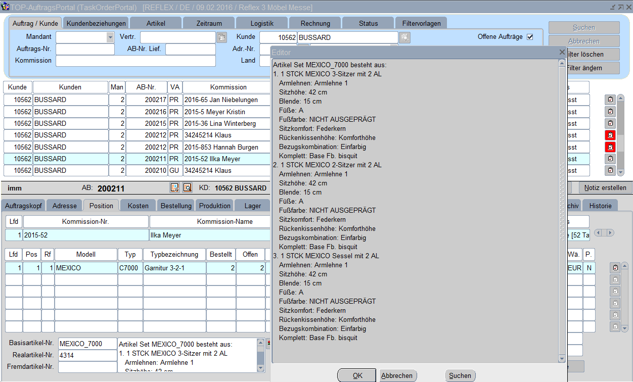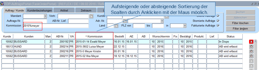 Die Suche „2015%meyer" im Feld Kommission liefert alle Auftragskommissionen die in der Kommissions-Nr. oder im –text diese Zeichenfolge (in dieser Reihenfolge) beinhalten, wobei das Prozentzeichen für eine beliebige Zeichenfolge zwischen den beiden Werten steht.
