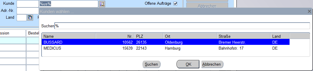 Ist die AB-Nummer nicht klar, so können durch Angabe der Kundennummer alle zu einem Kunden gehörenden Aufträge angezeigt werden. Sollte die Kundennummer nicht bekannt sein, kann nach dem Suchnamen selektiert werden. Hierbei ist die Groß- und Kleinschreibung nicht von Bedeutung. Wichtig ist aber unter Umständen das Prozentzeichen (%). Das Prozentzeichen ersetzt alle evtl. vorstehenden Zeichen der Suchkriterie im Kundensuchnamen. Werden zwei Suchbegriffe eingegeben so werden diese mit einem % voneinander getrennt.