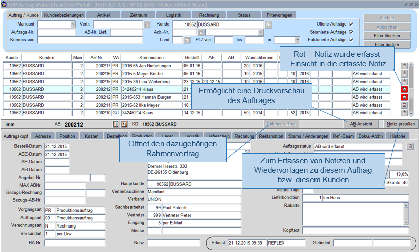 Über die unten stehenden Registerkarten Auftragskopf, Adresse, Position, Bestellung, Produktion, Logistik, Rechnung, Storno/Änderungen, Historie erhalten Sie eine genaue Information über den Auftrag und dem Auftragsstatus.