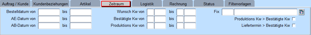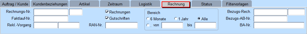 Solange alle Kennzeichen gesetzt sind, selektiert das System über alle Aufträge. Es kann jedoch auch eine Suche über nur „offene Aufträge" und oder „stornierte Aufträge" und oder „fakturierte Aufträge" erfolgen indem die entsprechenden Kennzeichen deaktiviert werden.