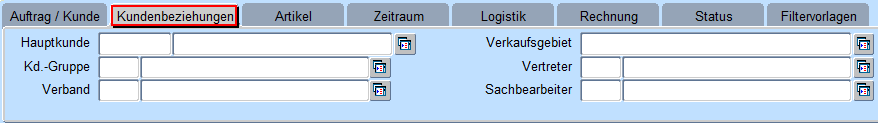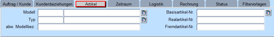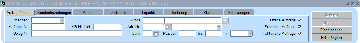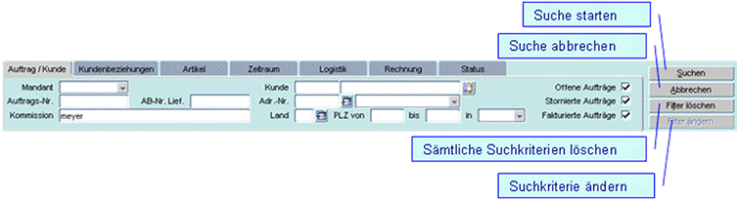 Anders als in anderen Masken wird hier nicht über die Abfrage selektiert sondern mit der Schaltfläche „Suchen" nachdem die Suchkriterie eingegeben wurde (Funktionen wie in der Kundensuche. War die Suche erfolglos bzw. die Trefferquote zu umfangreich, so kann die Suche mit „Filter löschen" bei ganz neuer Suchkriterie bzw. „Filter ändern" (die vorher eingegebene Suchkriterie wird nicht vom System gelöscht) neu begonnen werden. Nach Neueingabe bzw. Ändern der Suchkriterie wird die Selektion mit dem Button „Suchen" neu gestartet.