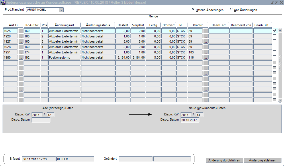 Soll eine Auftragsänderung abgelehnt werden, so geschieht das mit dem Button "Änderung ablehnen" nachdem die entsprechende Zeile markiert wurde.