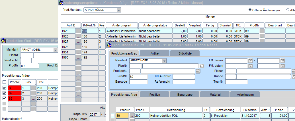 Wurde ein Auftrag geändert, der sich bereits in Produktion befindet (egal, ob die Produktion bereits gestartet wurde oder nicht, so erscheint die Produktions-Nr. in den Auskunftsdialogen gelb unterlegt, in der Form "Produktion Start" wird die Nr. rot unterlegt dargestellt: