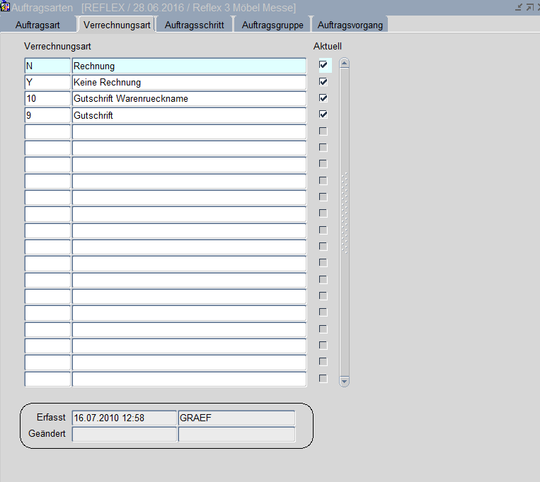 Diese Maske dient der Verwaltung aller einzelnen Verrechnungsarten. Die Kombination aus Verrechnungs- und Auftragsart ergibt den Auftragsvorgang, der in der Auftragsartsteuerung letztendlich die Steuerung des Auftrages bestimmt.