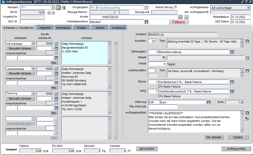 Im unteren Bereich der AB-Erfassung werden die Gesamtwerte für Faktura, EK, Gewicht und Volumen angezeigt.