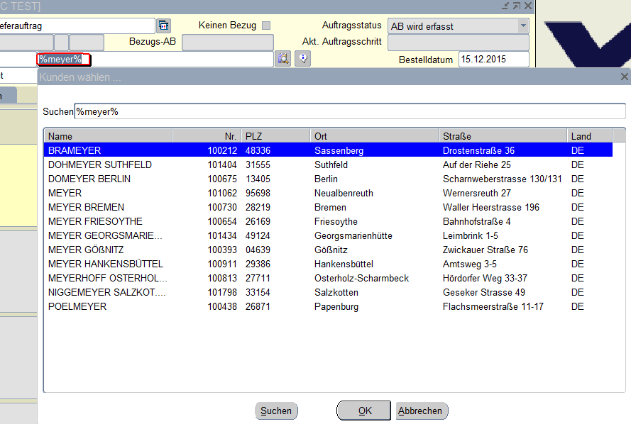 Sollte die Kundennummer nicht bekannt sein, kann nach dem Suchnamen selektiert werden. Hierbei ist die Groß- und Kleinschreibung nicht von Bedeutung. Wichtig ist aber unter Umständen das Prozentzeichen (%). Das Prozentzeichen ersetzt alle evtl. vorstehenden Zeichen der Suchkriterie im Kundensuchnamen. Werden zwei Suchbegriffe eingegeben so werden diese mit einem % voneinander getrennt.