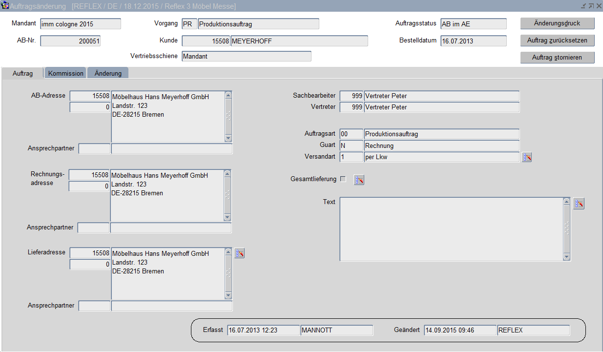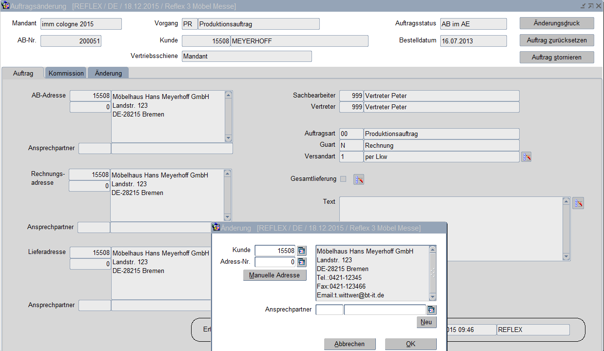 Die Änderungen und Stornierungen von Aufträgen erfolgen bei Überschreitung des Auftragsstatus "AB im AE" über die Anwendung „Meldeabhängige Änderungen“. Bei Einfluss auf Produktion und Logistik muss immer eine meldeabhängige Änderung gemacht werden. Man bekommt in einem Dialog die Änderungen angezeigt, die dann bestätigt oder abgelehnt werden müssen. Die meldeabhängigen Änderungen müssen von der Handelsfirma mit dem Werk geklärt werden.