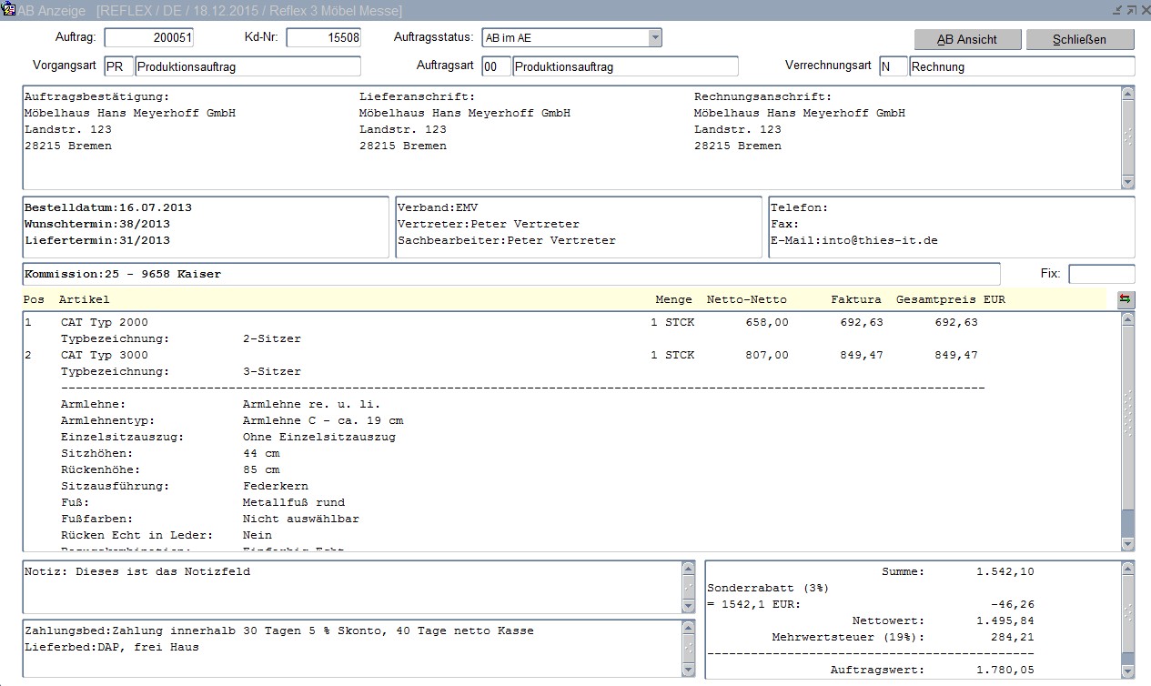 Alle für den Auftrag wichtigen Daten werden komprimiert auf einer Seite zur Prüfung dargestellt. Außerdem besteht die Möglichkeit, über den Button AB-Ansicht den Report der Auftragsbestätigung über den Button AB-Ansicht zu starten.