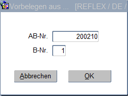 Über den Button „Vorbelegung" besteht die Möglichkeit eine komplette Kommission (mit Positionen ohne Preise) aus einem anderen Auftrag zu übernehmen. Bei Betätigung des Schalters erscheint eine Maske in der die AB-Nr. sowie die laufende Kommission-Nr. eingetragen werden kann. Folgende Regeln treffen hier zu: