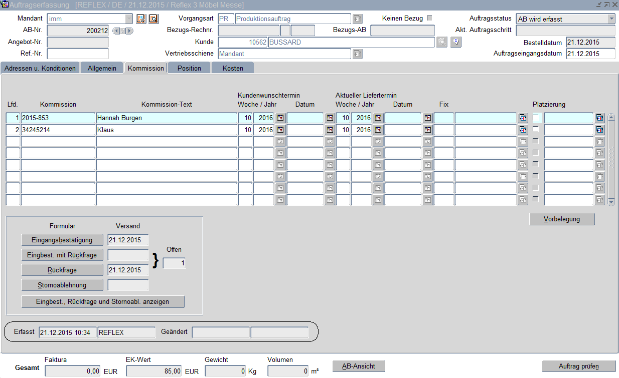 Solange noch keine Kommission gespeichert wurde, kann die Kundennummer und die Vertriebsschiene im Auftragskopf noch verändert werden.