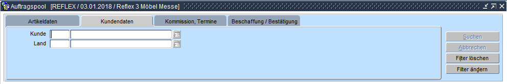 Die Ermittlung der anzuzeigenden Aufträge kann mandantengenau über verschiedene Suchkriterien in den Registerkarten Artikeldaten, Kundendaten, Kommission / Termine und / oder Beschaffung / Bestätigung erfolgen.