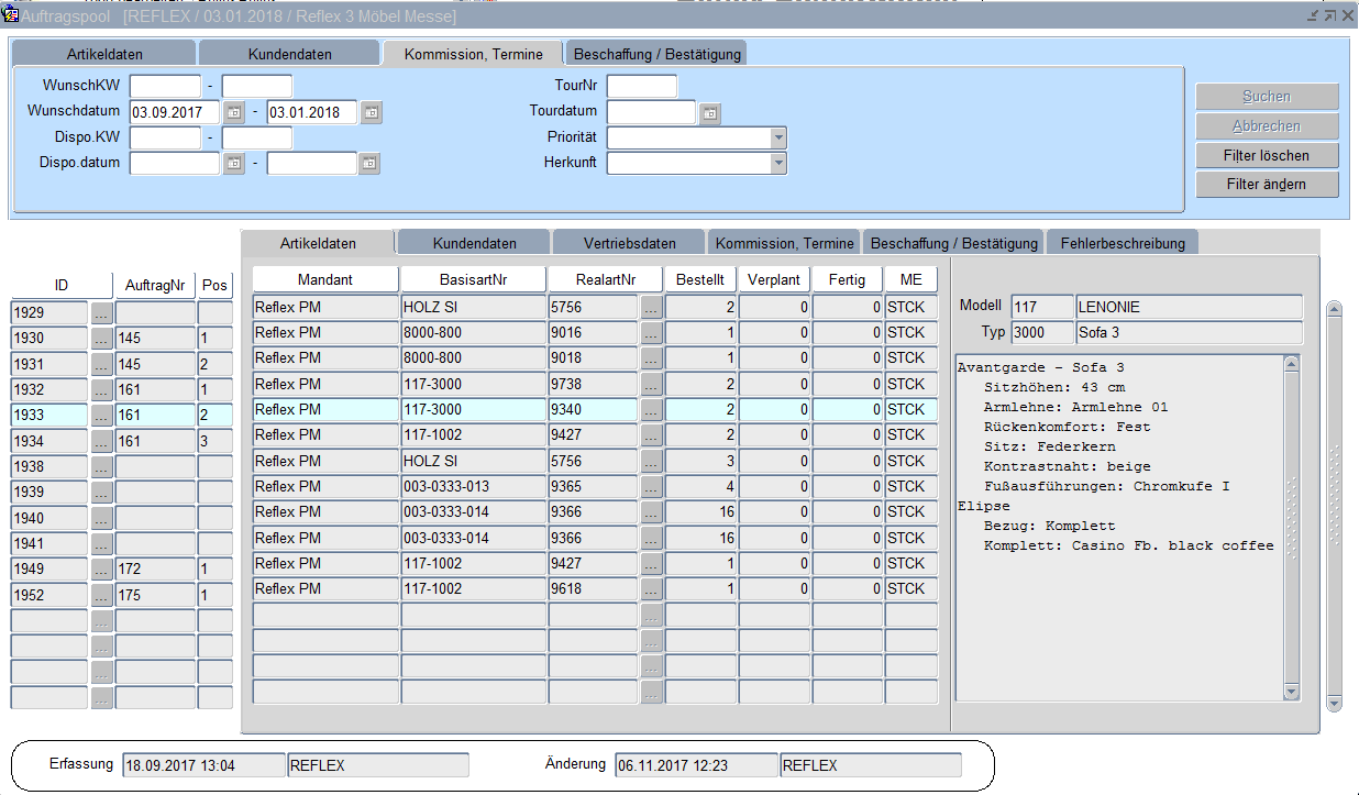 In den verschiedenen Registerkarten werden die Artikel-, Kunden-, Vertriebs- und Termindaten angezeigt. Wurde bei der Übergabe in die Produktion vom System ein Fehler festgestellt, so kann dieser in der Registerkarte "Fehlerbeschreibung" gesichtet werden. Über die verschiedenen Button ... können weitere Auskünfte eingeholt werden.