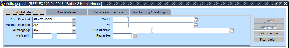 Die Ermittlung der anzuzeigenden Aufträge kann mandantengenau über verschiedene Suchkriterien in den Registerkarten Artikeldaten, Kundendaten, Kommission / Termine und / oder Beschaffung / Bestätigung erfolgen.