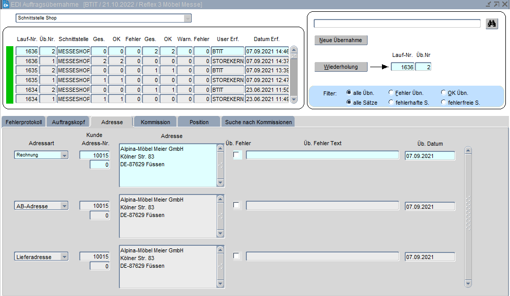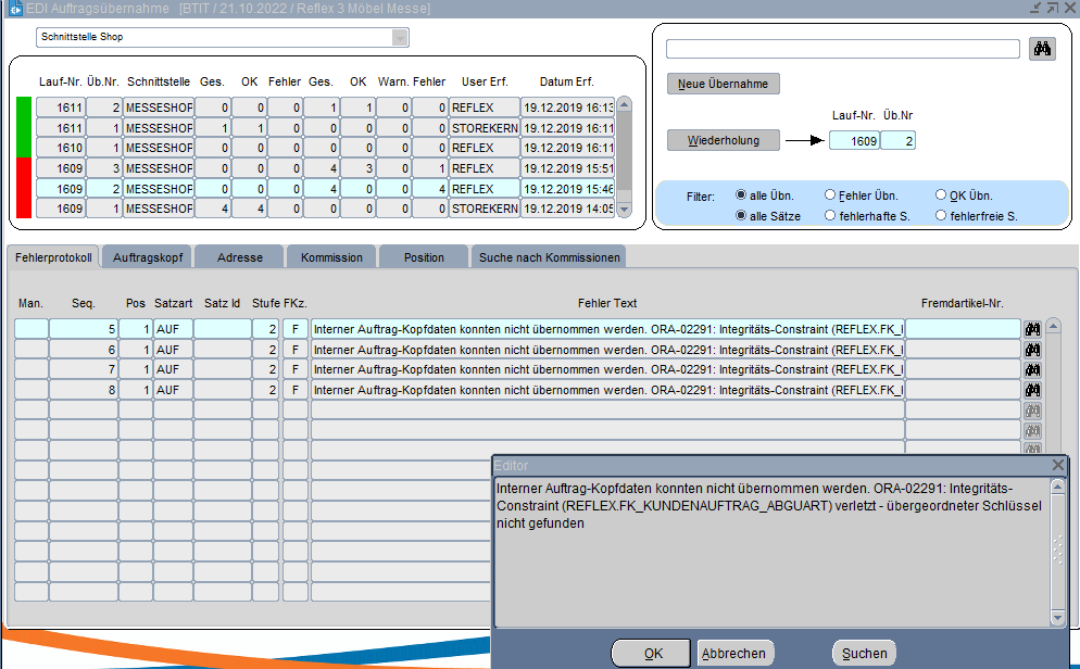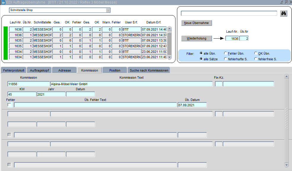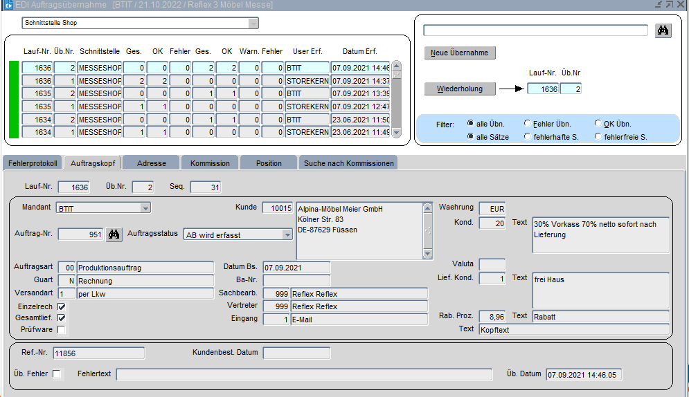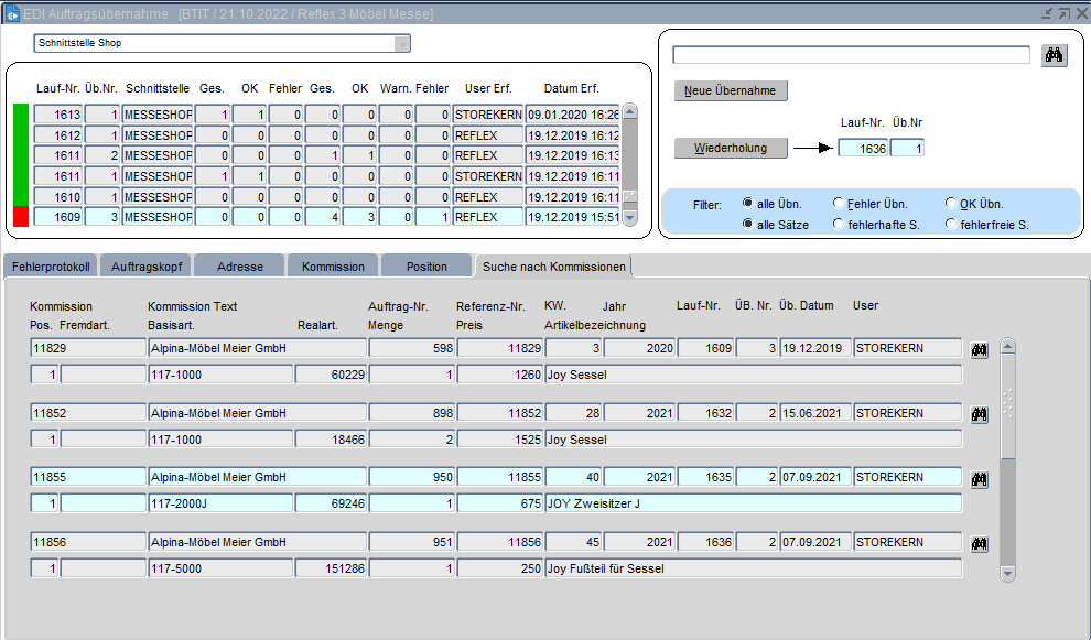 Über EDI können Aufträge aus Fremdsystemen in Reflex gelangen. Mit dem Button "Neue Übernahme" wird die Übernahme gestartet und vom System auf Fehler bzw. fehlende Stammdaten geprüft. Die Daten der übernommenen Aufträge stehen in den Registerseiten Auftragskopf, Adresse, Kommission und Position. Bei der erfolgreichen Übernahme wird das Ampelsystem grün angezeigt. Trifft die Übernahme auf einen Fehler, so wird dieser in dem Register Fehlerprotokoll angezeigt. Die Ampel ist in diesem Falle rot. Eine Suche nach Kommissionen über sämtliche EDI-Läufe kann in der gleichnamigen Registerseite vorgenommen werden.