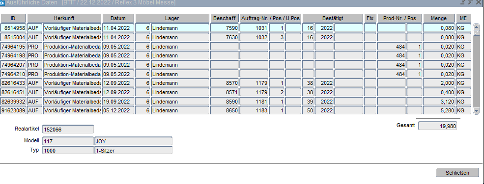 Die detaillierten Daten, worauf sich die Bedarfe beziehen, werden in dieser Maske aufgeführt.