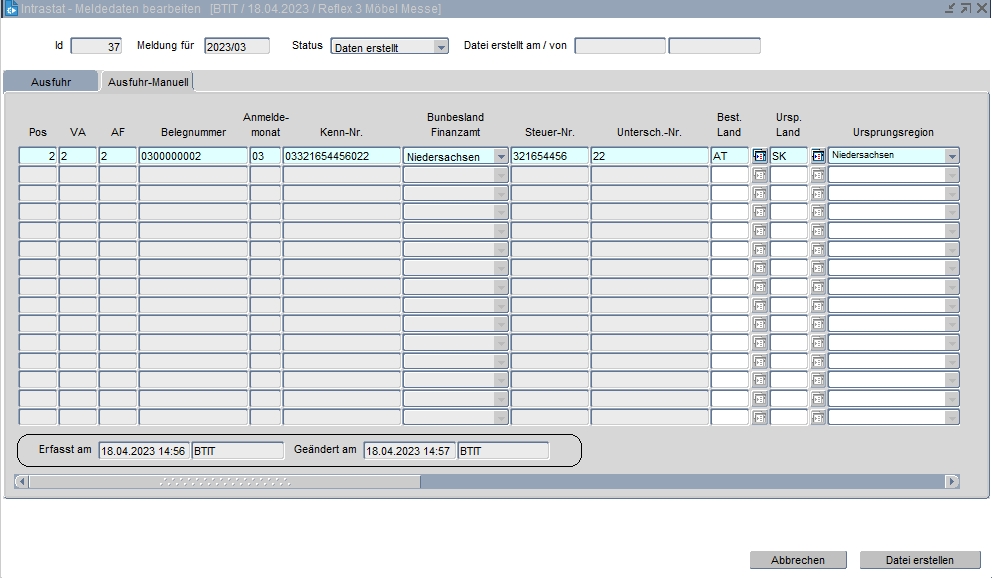 Über diese Registerkarte besteht die Möglichkeit Daten manuell für die Meldung zu erfassen, zu denen es in Reflex keine Lagerbewegungen oder fakturierte Aufträge gibt. Wurden die erfassten Daten gespeichert, so werden die grau hinterlegten Felder automatisch aus den Stammdaten gefüllt. Die Auswertungen werden dann entsprechend um diese Daten erweitert.