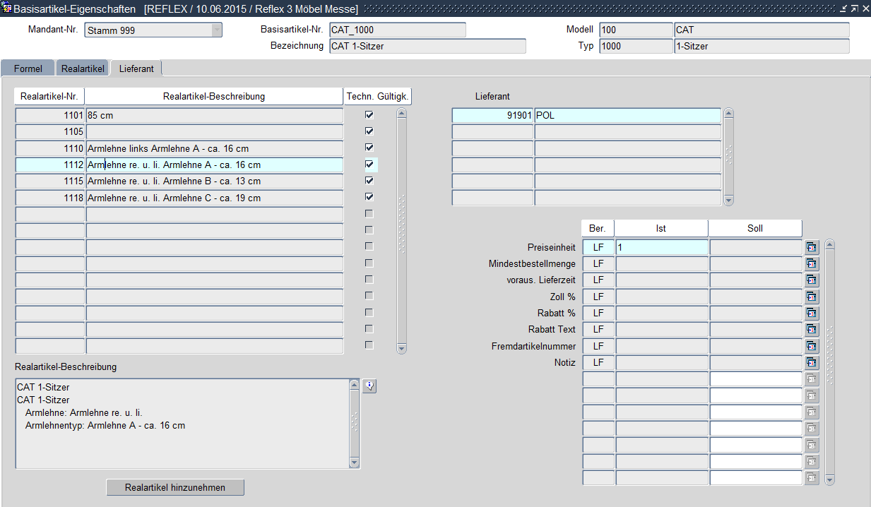 Beschreibung des Realartikels. Die Beschreibung erfolgt automatisch vom System bei der Erstellung des Realartikels und setzt sich aus der Bezeichnung des Basisartikels und sämtlichen Merkmalen des Realartikels zusammen.