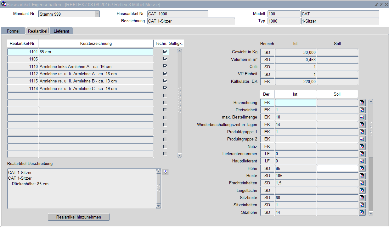 Im rechten Bildschirm sind die Eigenschaften des links markierten Realartikels zu erkennen. Die "Istwerte" sind die Werte aus der Stammdatenmaske des Basisartikels. Die Sollwerte können an dieser Stelle dem jeweiligen Realartikel bei Abweichung zugeordnet werden. Gibt es keine abweichenden Werte, so bleibt das Feld leer. Der Bereich der Daten sagt aus, aus welcher Registerkarte des Basisartikels (Stamm, Einkauf, Lieferant, Verkauf) die IST-Daten stammen.