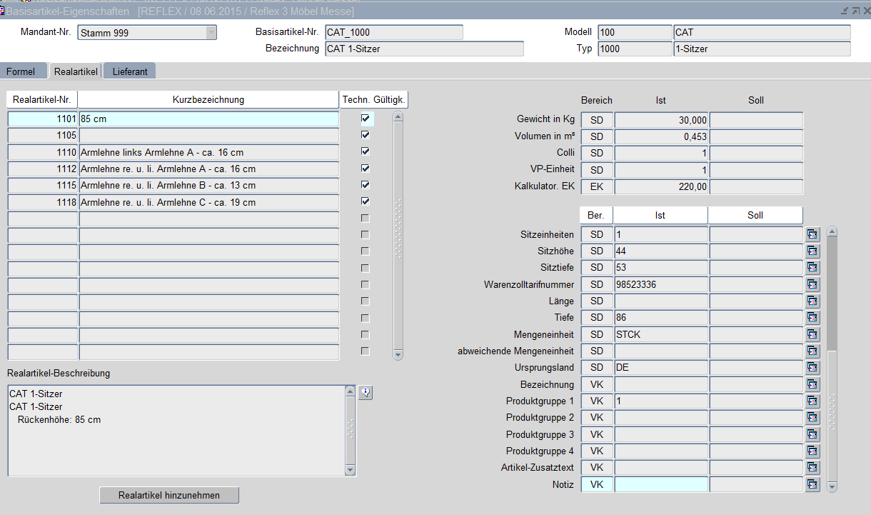 Beschreibung des Realartikels. Die Beschreibung erfolgt automatisch vom System bei der Erstellung des Realartikels und setzt sich aus der Bezeichnung des Basisartikels und sämtlicher Merkmale des Realartikels zusammen.