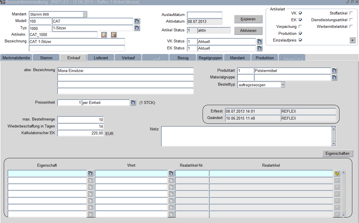 In dieser Maske werden alle einkaufsrelevanten Daten zum Basisartikel gespeichert. Im unteren Teil der Maske besteht die Möglichkeit, einzelne Eigenschaften für bestimmte Realartikel mit einem abweichendem Wert zu hinterlegen. Über den Button "Eigenschaft" besteht die Möglichkeit, alle Eigenschaften für die Realartikel aus sämtlichen Registerkarten zu überblicken.