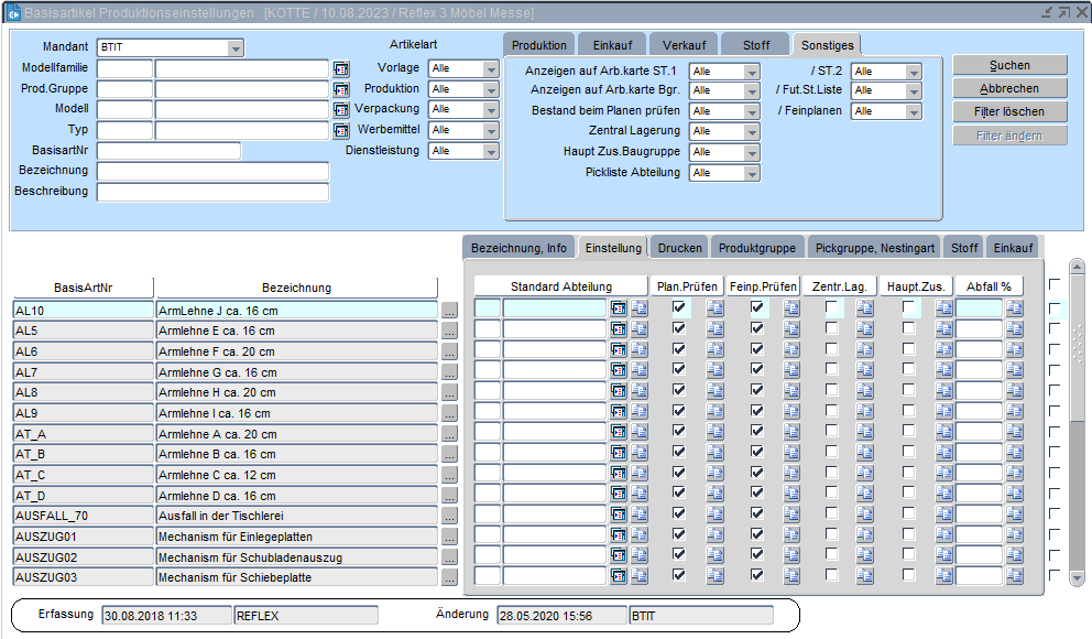 Mit der den Kennzeichnungen der Prüfung Planung und Feinplanung besteht jetzt die Möglichkeit unterschiedliche Einstellungen je Basisartikel bezüglich der Lagerbestandsprüfung vorzunehmen (Button „Materialbedarf“ in der Produktionsplanung und Button „Prüfen“ in der Feinplanung).