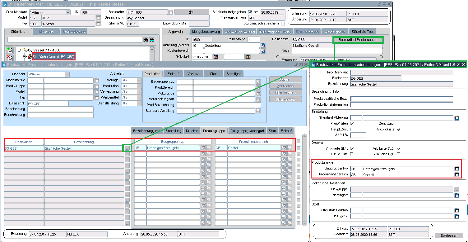 Bei unserem Beispiel muss der Basisartikel BG GES den Baugruppentyp „UE” und Produktionsbereich „GB” haben.