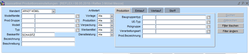 Die Maske dient der Eingabe von verschiedensten Parametern in Bezug auf den Basisartikel. Die Einstellungen erfolgen in den verschiedenen Registerkarten - die jeweiligen Basisartikel können über eine umfangreiche Suche für diesen Zweck selektiert werden.