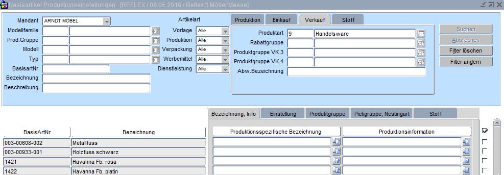 Die Maske dient der Eingabe von verschiedensten Parametern in Bezug auf den Basisartikel. Die Einstellungen erfolgen in den unterschiedlichen Registerkarten - die jeweiligen Basisartikel können über eine umfangreiche Suche für diesen Zweck selektiert werden.