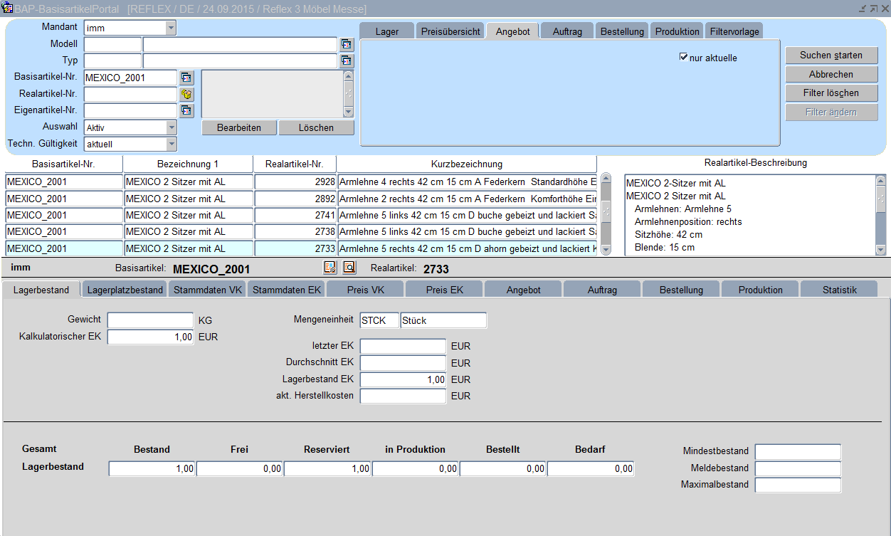 Anhand der Registerkarte Angebot besteht die Möglichkeit, die Suche bestimmter Artikel aus Angeboten zu selektieren. Die Ermittlung der anzuzeigenden Daten kann mandantenübergreifend über verschiedene Suchkriterien erfolgen. Ebenfalls können Artikel aufgrund von Merkmalen und Ausprägungen gefiltert werden. Grundsätzlich können die Suchkriterien im linken Feld um die Filter der jeweiligen Registerkarte erweitert werden, um die Auswertung in den unten stehenden Registerkarten einzuschränken.