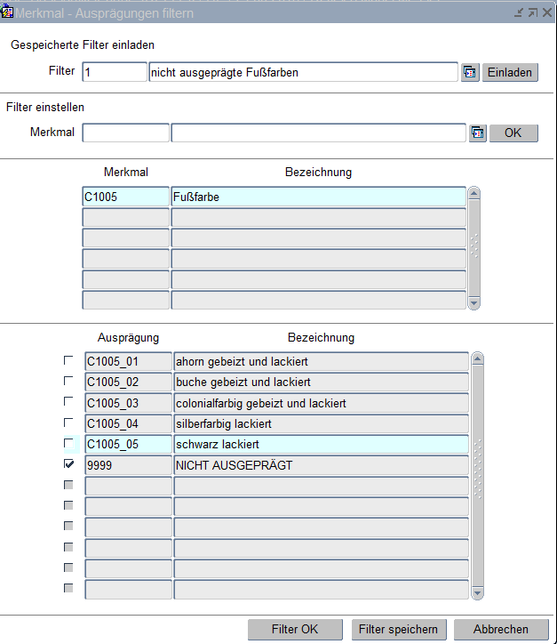 Kurzbezeichnung und Bezeichnung des Merkmales. Anhand der Werteliste kann das Merkmal selektiert werden. Mit dem Button "OK" wird das Merkmal in den Filter übernommen. Dieser Vorgang kann für beliebig viele Merkmale wiederholt werden. Gefiltert wird dann die Kombination der verschiedenen ausgewählten Merkmalsausprägungen.